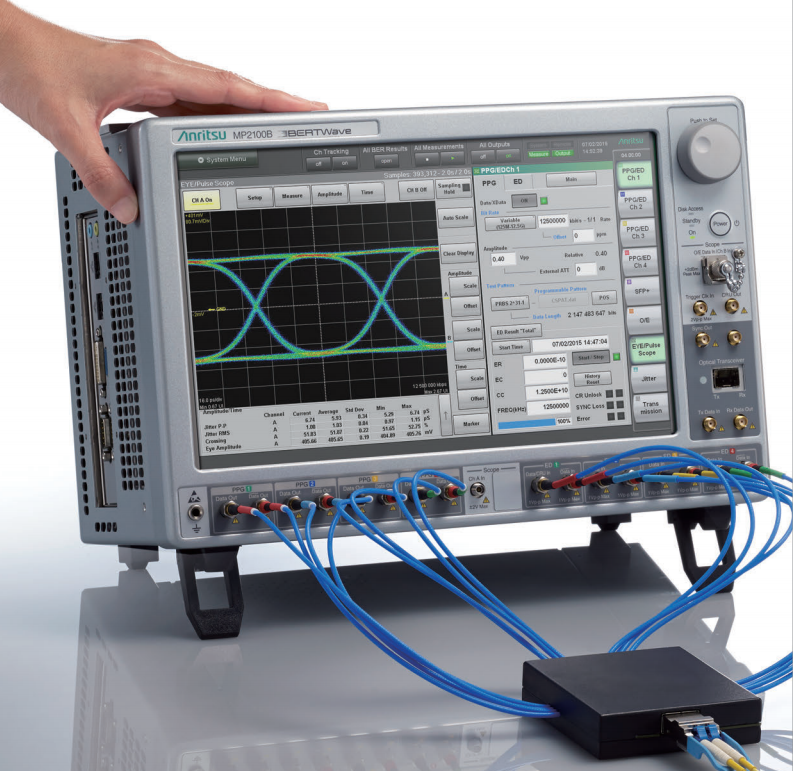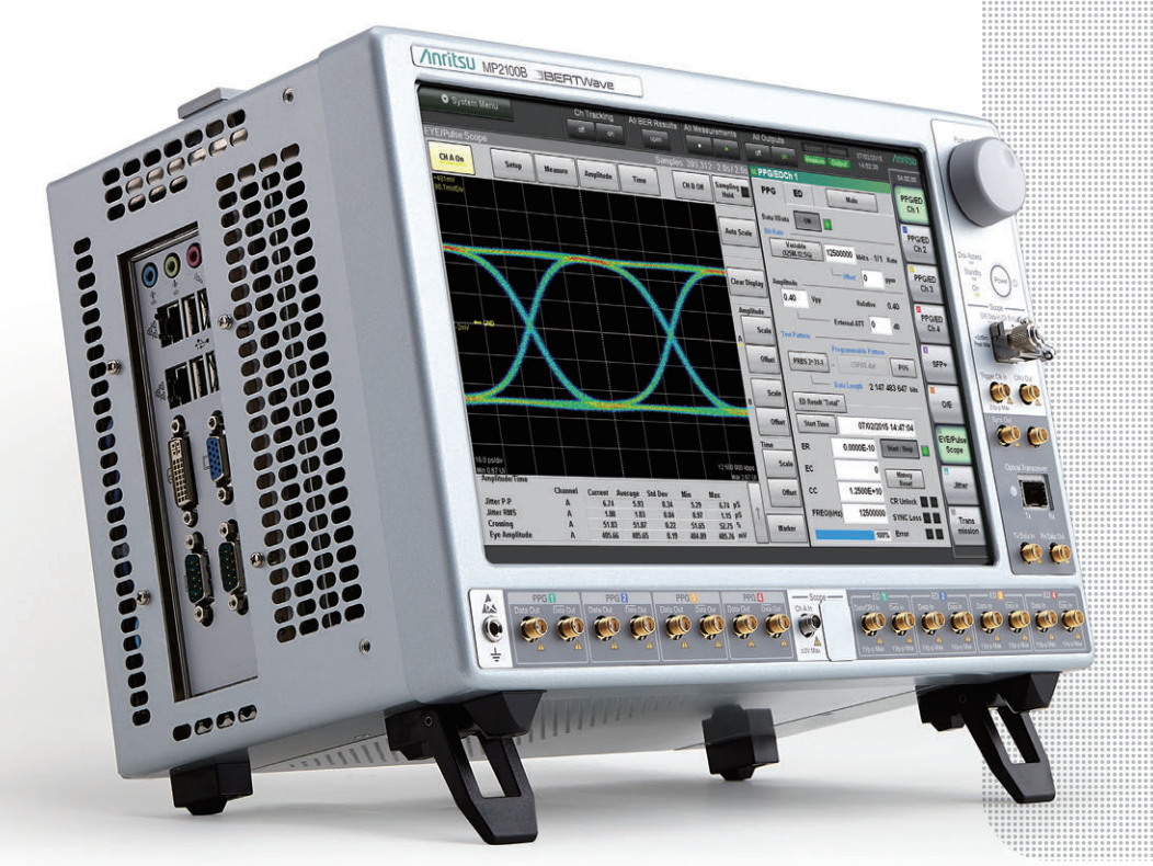 BERT和采样示波器是评估光学通讯系统中使用的光学模块时必要的测试仪。以前在评估QSFP+和SFP+等模块时,需要分别配置BERT和采样示波器。现在有了 BERTWave MP2100B,其多合一设计将多达4通道的BERT和采样示波器集成于一个小巧的18-cm深的单一机柜中,大大削减了设备投资成本,节省了作业空间。此外,使用 BERTWave MP2100B 时,无需变更连接线即可同步进行BER测量、眼图模板测试和眼图分析,从而缩短了测量时间。而且,BER测量通道可扩展至四个,4通道BER测量、眼图模板测试和眼图分析可同步进行。最后,内置的SFP+模块插槽可无需使用外部光源。