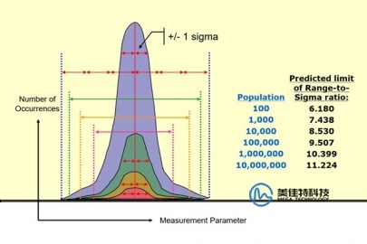 统计模型对现实世界系统行为的预测程度如何?在许多信号完整性应用中,例如在给定误码率(BER)下估计随机抖动,统计分布的给定总体用于推断潜在的未来结果。同样,图 1 描述了一个模型,该模型预测高斯分布的各种总体大小的直方图范围与直方图西格玛(一个标准差)的比率。预测表明,随着人口的增长,范围与西格玛之比的限制增加。