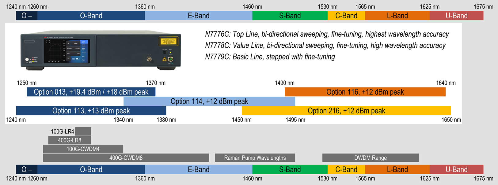 与其前身 81600B 和 81606A 一样,新型 N7776C 可调谐激光源由光子应用套件软件支持,用于测量插入损耗、偏振相关损耗和色散的光谱。新型激光器与 N774xC 多端口功率计和 N7786C 偏振合成器相结合,可提供最佳的扫描波长精度和出色的动态范围,用于测量滤波阻带和通带。
