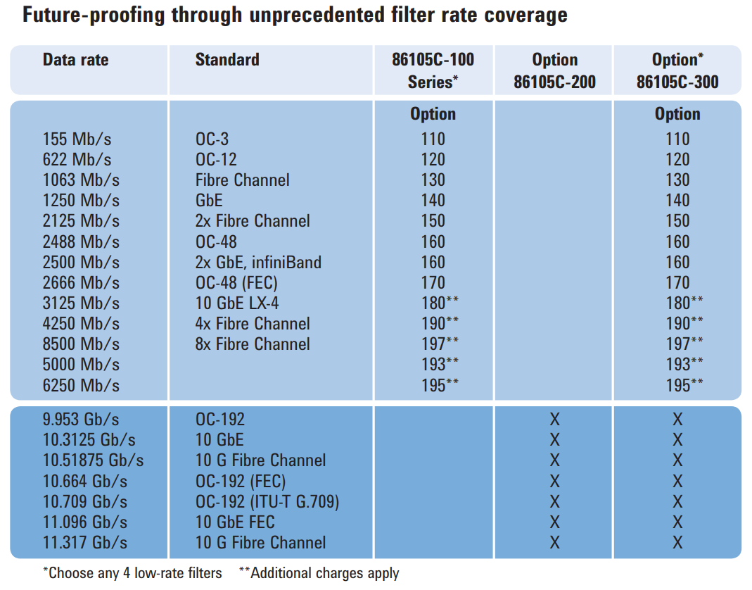 设计适合您应用的模块:四个低数据速率滤波器(选件 100)、多 9G 滤波器(选件 200)的组合,或低数据速率滤波器和多 9G 滤波器的组合(选件 300)