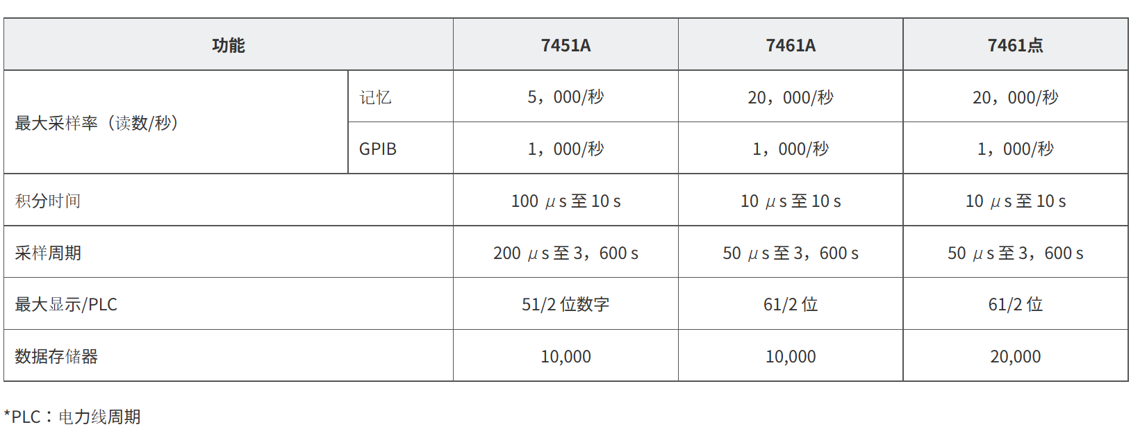 通过采用新开发的可变积分时间 A/D 转换器,7461A 或 7461P 和 7451A 分别以 31/2 位分辨率实现了每秒 20,000 个读数和每秒 5,000 个读数的最高采样率。7461A 或 7461P 的采样间隔可在 50 μs 至 3,600 s 之间设置,7451A 的采样间隔可在 200 μs 至 3,600 s 之间设置,从而能够以精确的测量间隔进行高速数字化和数据记录。