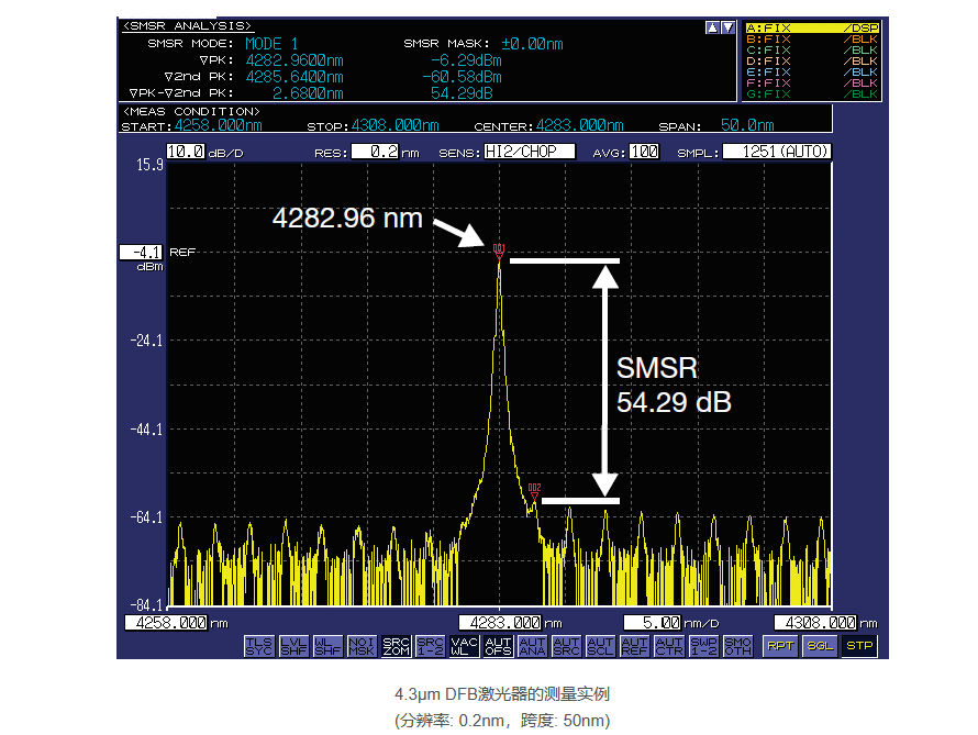 AQ6377具有73 dB的功率动态范围和50 dB的近距离动态范围,比在5μm波段工作的干涉仪型仪器的功率动态范围大2000倍,近距离动态范围大10倍。AQ6377能够评估半导体激光器的边模抑制比特性,市场上尚无其它如此高性能的同类设备 。