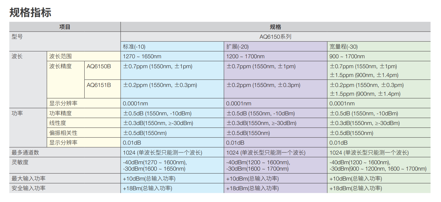 AQ6150系列一共有两个机型。其中, AQ6151B是高精度型光波长计,波长精度高达±0.2ppm,可以满足高级别的精度测量要求。 AQ6150B是标准型光波长计,波长精度可达 ±0.7ppm,适用于对精度要求不高的测量应用,价格更加实惠。
