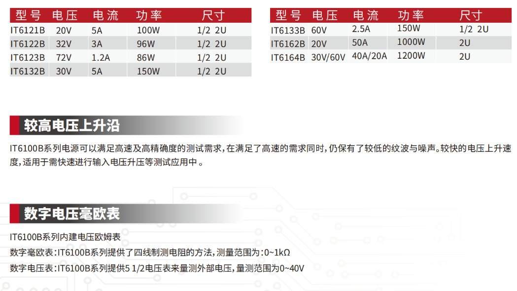IT6100B系列(86~1200W)为高速高精度的可编程直流电源,具有较高电压上升沿,满载上升可达500us,分辨率可达0.1mV / 0.01mA,输出波形优先模式可让电压或电流的上升波形高速且无过冲,在电源模块等高精度测试场合有较多应用。内置标准USB/RS232通讯接口,面板支持List编程,给使用带来很大的方便,可以根据客户设计和测试的需要,提供多用途的解决方案。