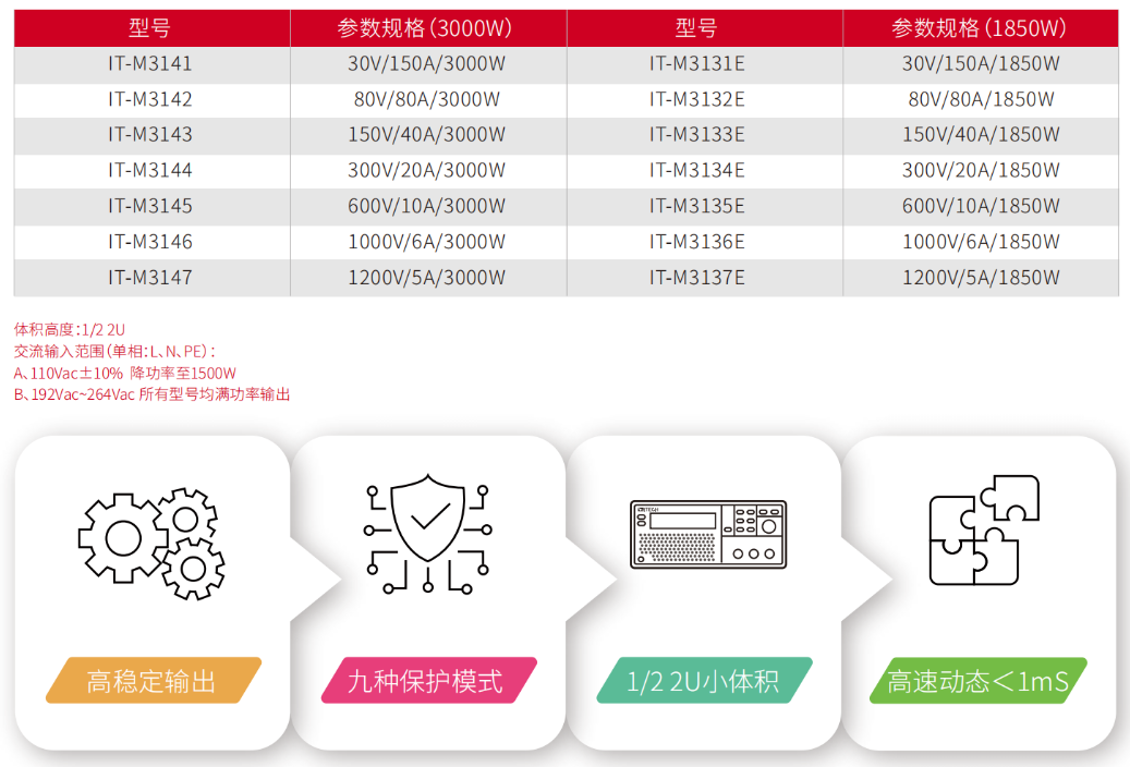 IT-M3140系列高功率密度可编程直流电源是一款集高稳定输出、高速动态响应(<1ms)、9种保护功能以及LIST编程模式于一体的产品。在1/2 2U小体积尺寸内,提供30V~1200V,1850W&3000W的输出能力,满足电动工具、电动自行车、无人机、电源模块以及半导体等领域应用。