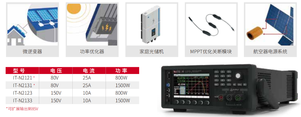 IT-N2100系列太阳能阵列模拟器是一款具有IV曲线快速变化的高性能直流电源,用于模拟各种太阳能电池板在不同环境(温度、光照、阴影衰减、老化度)下的IV输出特性。可用于太阳能微逆变器、功率优化器、卫星电源系统、帆板电源阵列等测试验证。该系列具备低纹波低噪声和高速MPPT跟踪速度,可多通道同步控制并具有高耐压拓扑结构。
