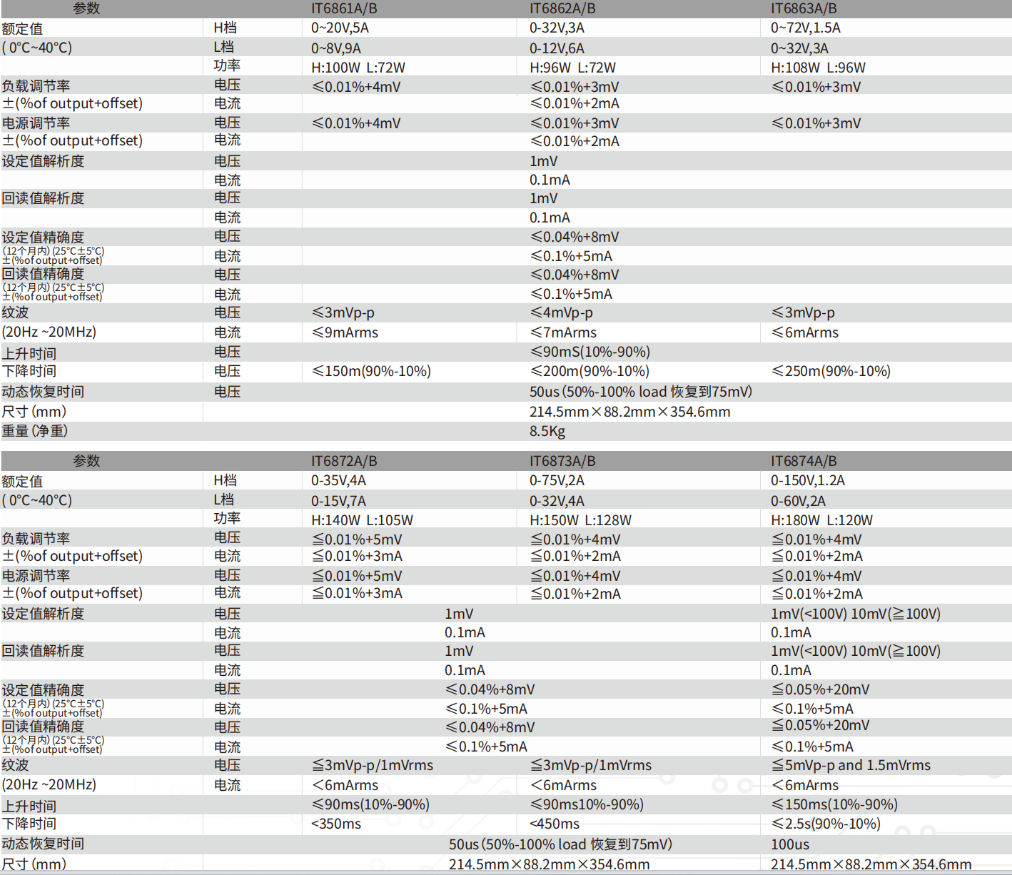 IT6800A/B系列双范围可编程直流电源(72-180W),每台电源具有两个电压、电流输出范围,一台电源可以当两台使用,更大节约使用者的成本和空间。具有1mV / 0.1mA的高分辨率。同时支持面板List编程和通过计算机进行软件操作,满足更多的通讯需求。适用于实验室测试、产线生产测试、维修检测等。