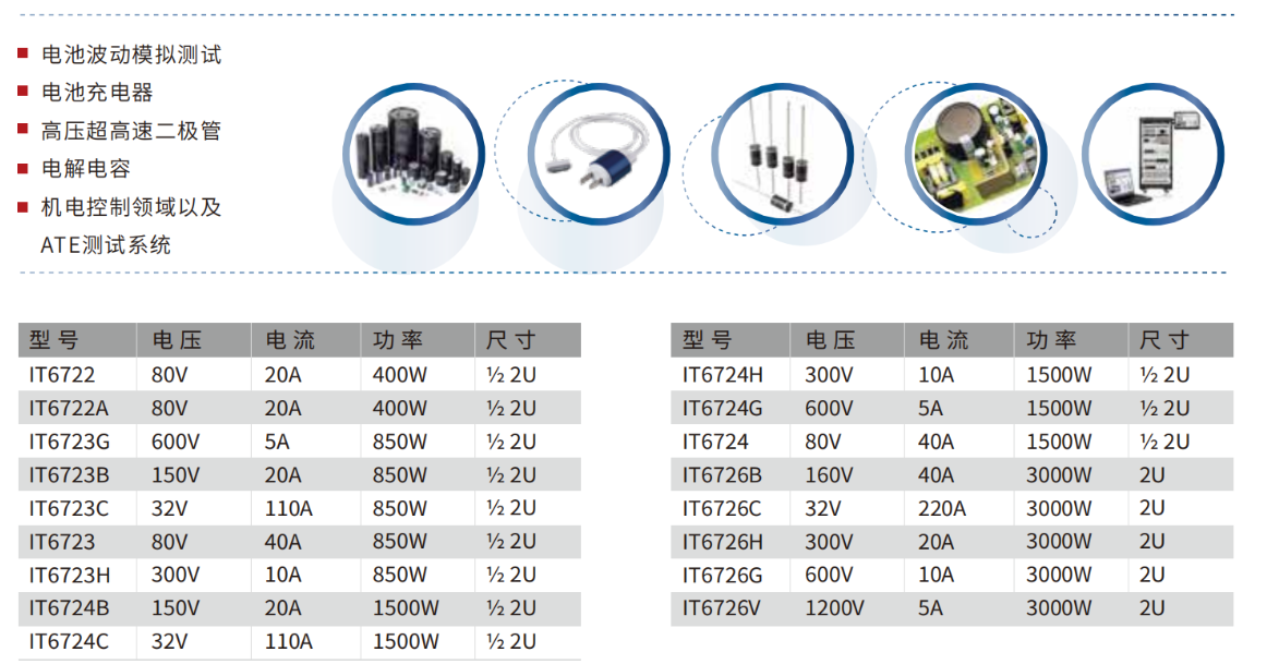 IT6700H高压直流电源,输出功率可达3000W,电压0-1200V,电流0-110A可调,具有桌面型和上架安装功能,操作更方便。提供list模式,内置RS232/USB通讯接口,具有丰富的SCPI指令,方便组建各种智能化的测试平台。广泛应用于电池充电测试、功率半导体器件静态参数测试、电解电容、电源模块电性能以及机电控制领域等需要使用高压低流直流电源的领域。